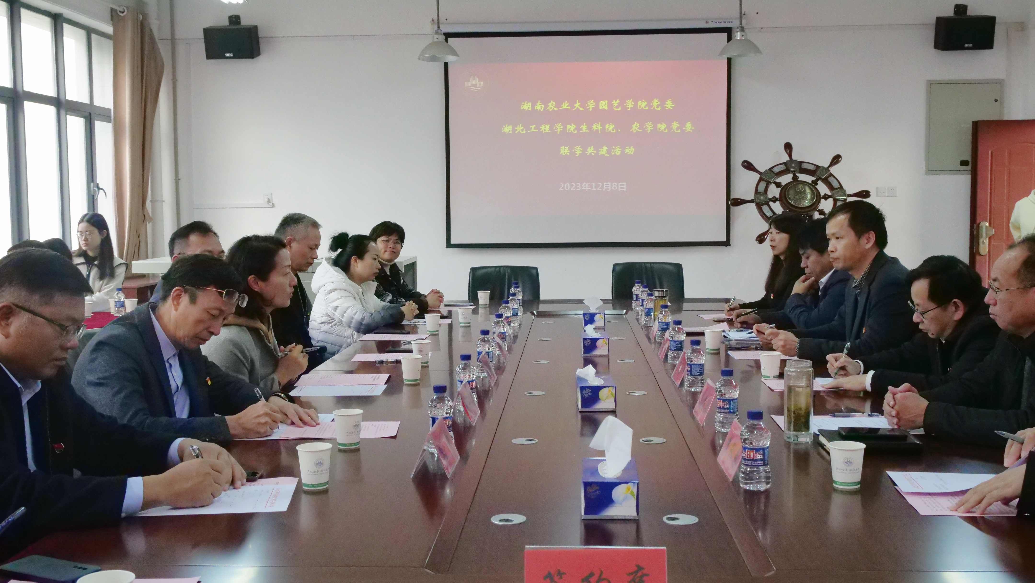 (通讯员 彭淼 唐雅伦)12月8日,永利yl23411党委书记覃红燕带队到湖北工程学院考察交流,与该校生命科学技术学院、农学院党委开展联学共建活动。湖北工程学院党委副书记、副校长丁远坤,生科院、农学院院长姜益泉,党委书记陈敢及院党委成员、园艺专业党员教师参加联学共建活动。活动由覃红燕、陈敢共同主持。