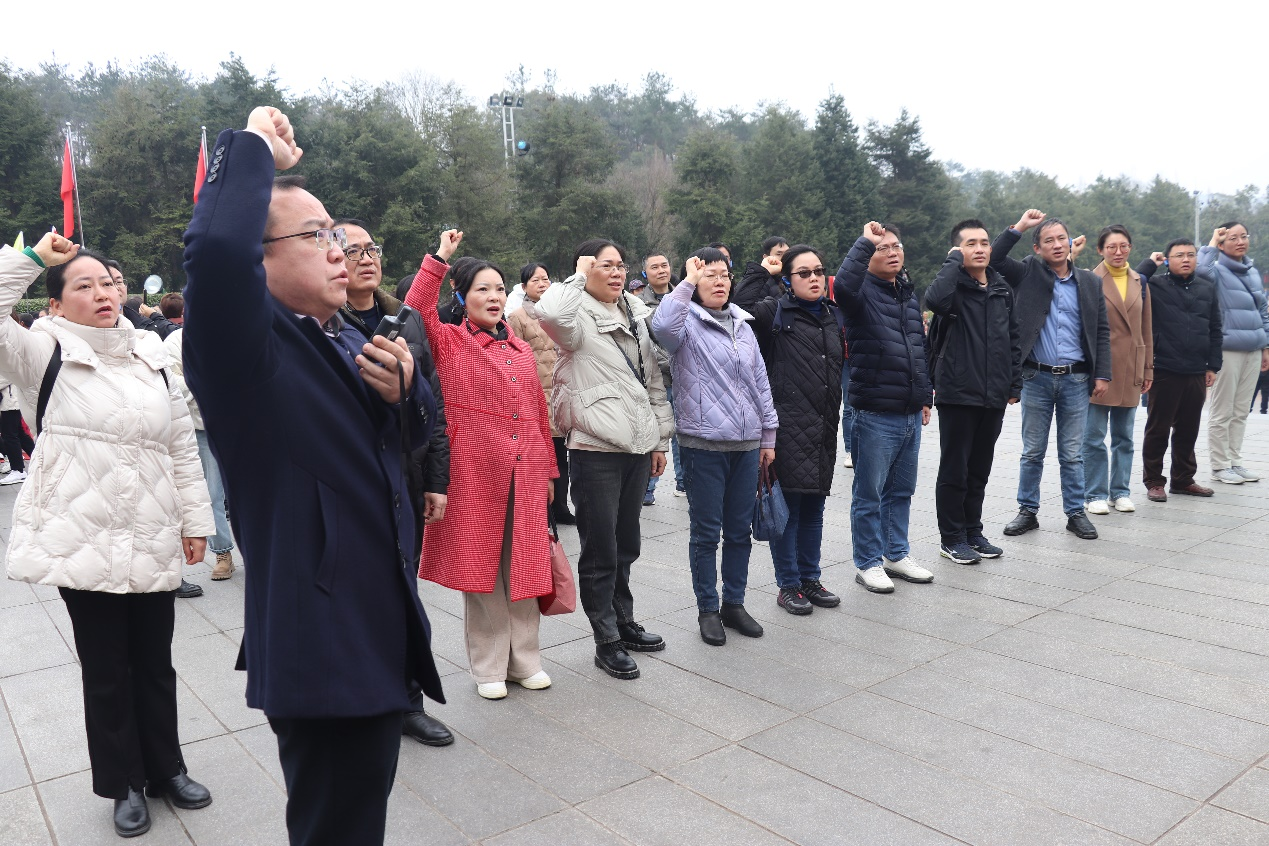 教师们在毛泽东铜像前敬献花篮、鞠躬致敬,表达深切的敬仰缅怀之情,并重温入党誓词,全体党员面对党旗郑重宣誓,坚定忠诚信念,铿锵有力的宣誓声回响在伟人故里。