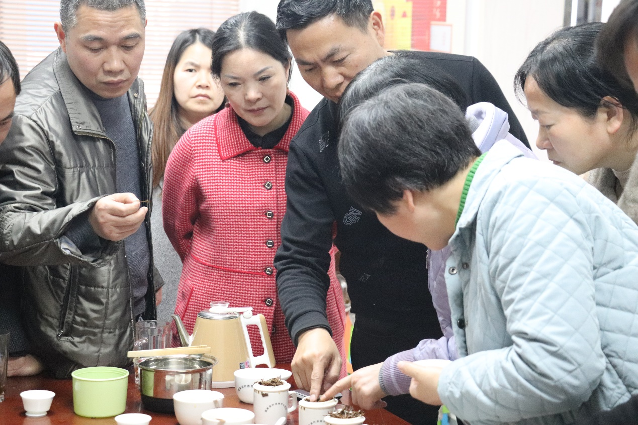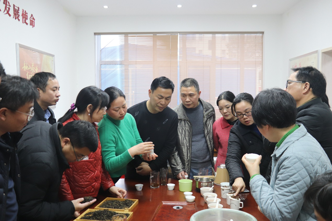 随后,一行人来到湖南省韶山茶业有限公司进行交流指导,公司负责人介绍了当地茶产业发展现状及公司产品研发情况,阐述了当前产品研发方面的困惑。在审评过该企的几种茶叶后,老师们集思广益,为其拼配出了“黄金比例”。针对当前社会背景和市场状况,双方都认为当地茶企应找准伟人故里红色优势,把握政策机遇,打造特色更鲜明、品牌更响亮、品质更优异的代表性湘茶,为湖南红茶的发展注入源源动力。