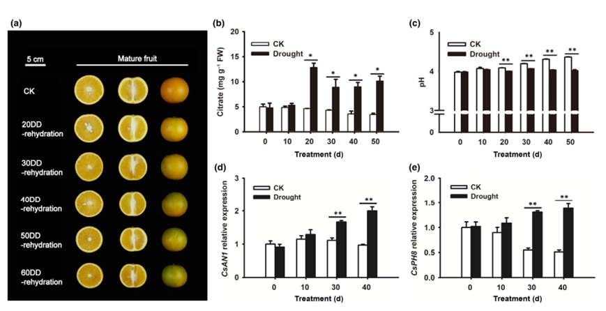 有机酸是柑橘果实内在品质的重要组成,直接影响果实风味及消费者的认可度。研究发现,在7-9月(果实膨大期)冰糖橙持续干旱20d以上,果实膨大受阻;持续干旱30d以上显著影响果实酸积累,果实中酸含量尤其是柠檬酸发生不可逆升高,即使后期复水也无法逆转果实变小和高酸表型。研究结果为柑橘科学灌溉提供了理论依据。