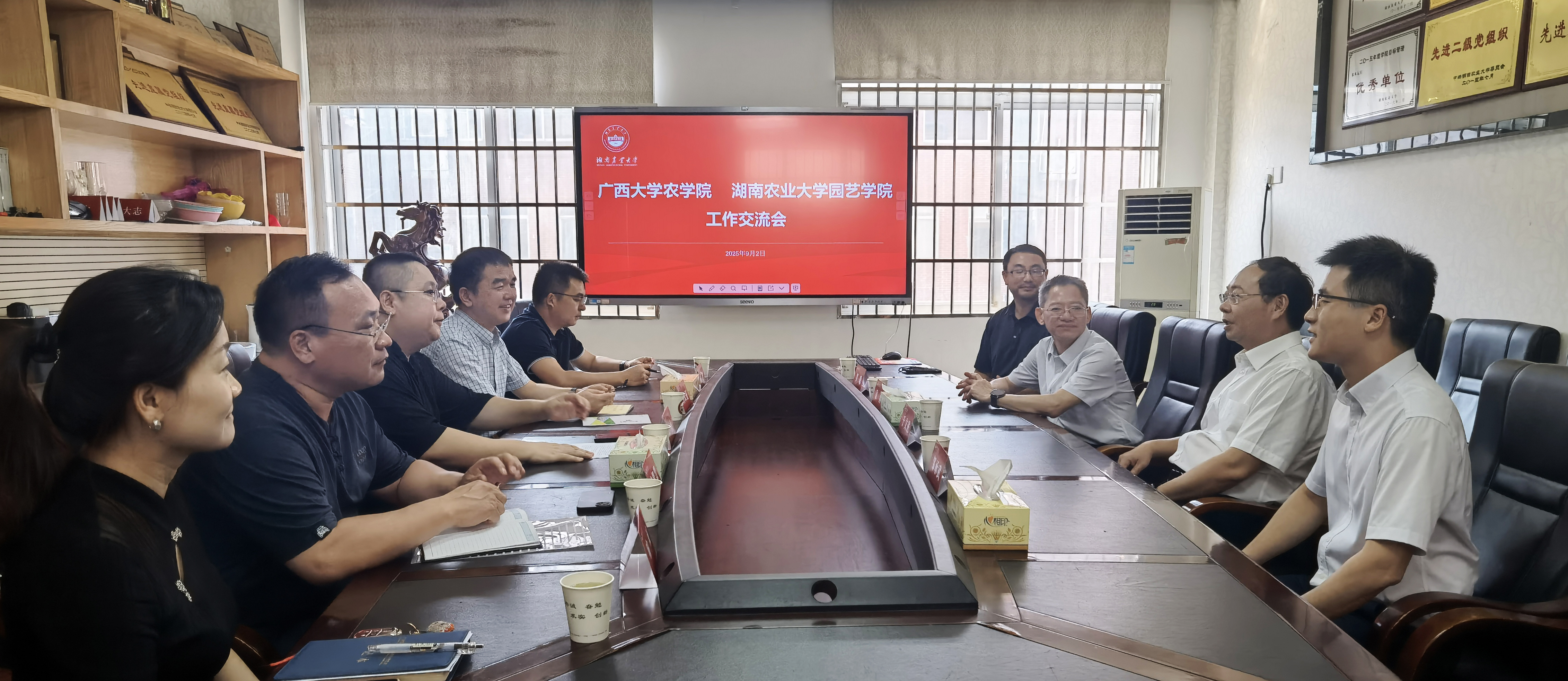于文进介绍了广西大学及农学院的历史沿革和近年来的发展情况。邹承武详细介绍了广西大学农学院在学科建设、人才培养、教育教学、科学研究、社会服务等方面的建设情况和改革举措。于文进表示,通过此次交流对话,两院相互加深了了解,希望日后能持续在学科建设和社会服务等方面加强沟通合作,服务地方,共同为强国建设作出新的更大贡献。