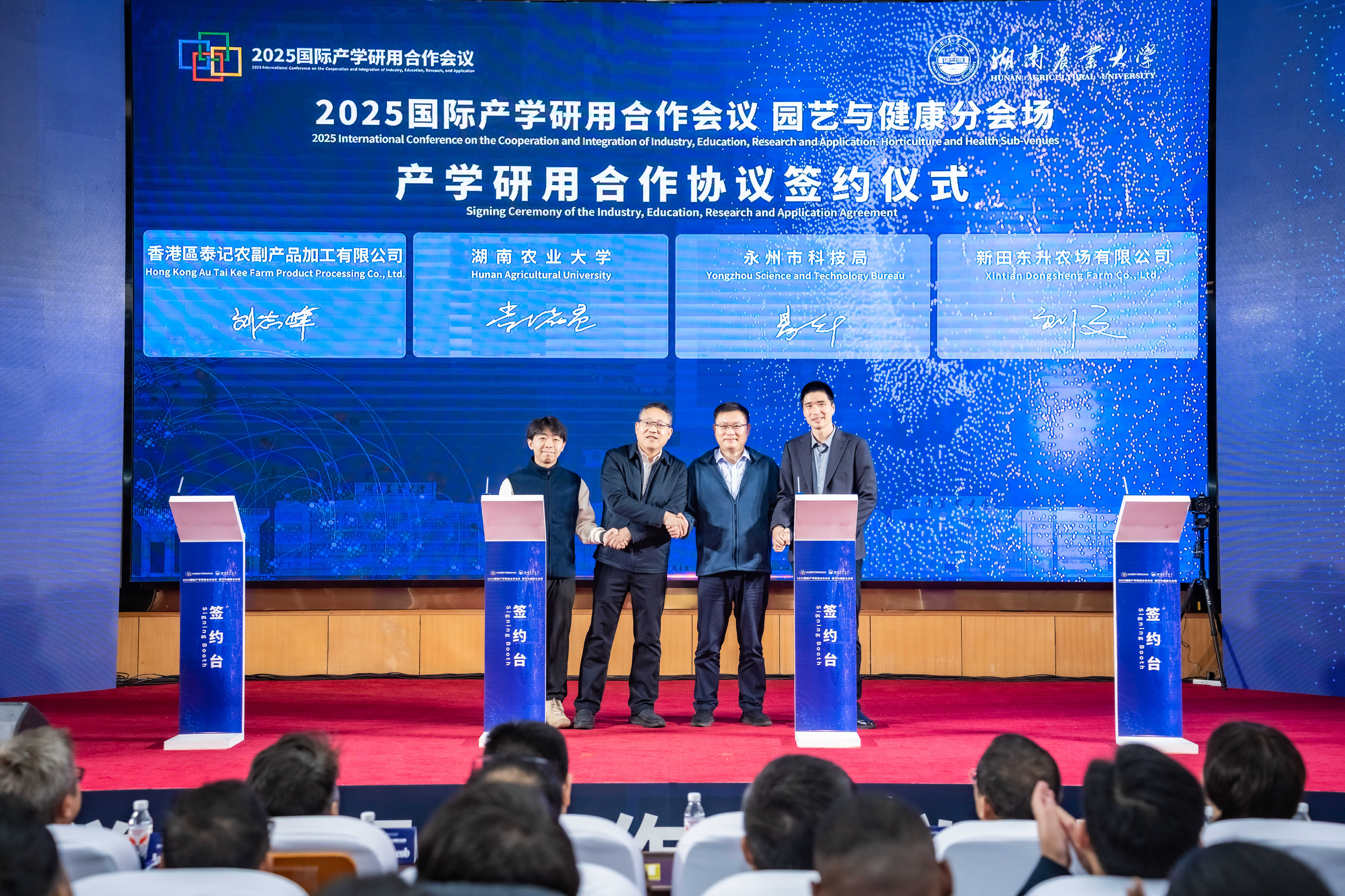 谢方平为新加坡南洋理工大学Jarkko Salojärvi教授、意大利帕多瓦大学Giovanni Battista Tornielli教授颁发兼职合作导师聘书。我校园艺学科相关团队与永州市科技局、新田东升农场、香港区泰记农副产品加工有限公司签署四方合作协议;与益阳市资阳区人民政府、湖南沃工农业服务有限公司、泰国Suptawee Engineering Co.,Ltd.签署产学研用四方合作协议。永州市科技局党组书记、局长易先平,益阳市资阳区委常委、副区长万巍,我校社会服务处副处长李绪孟分别代表各方上台签约。