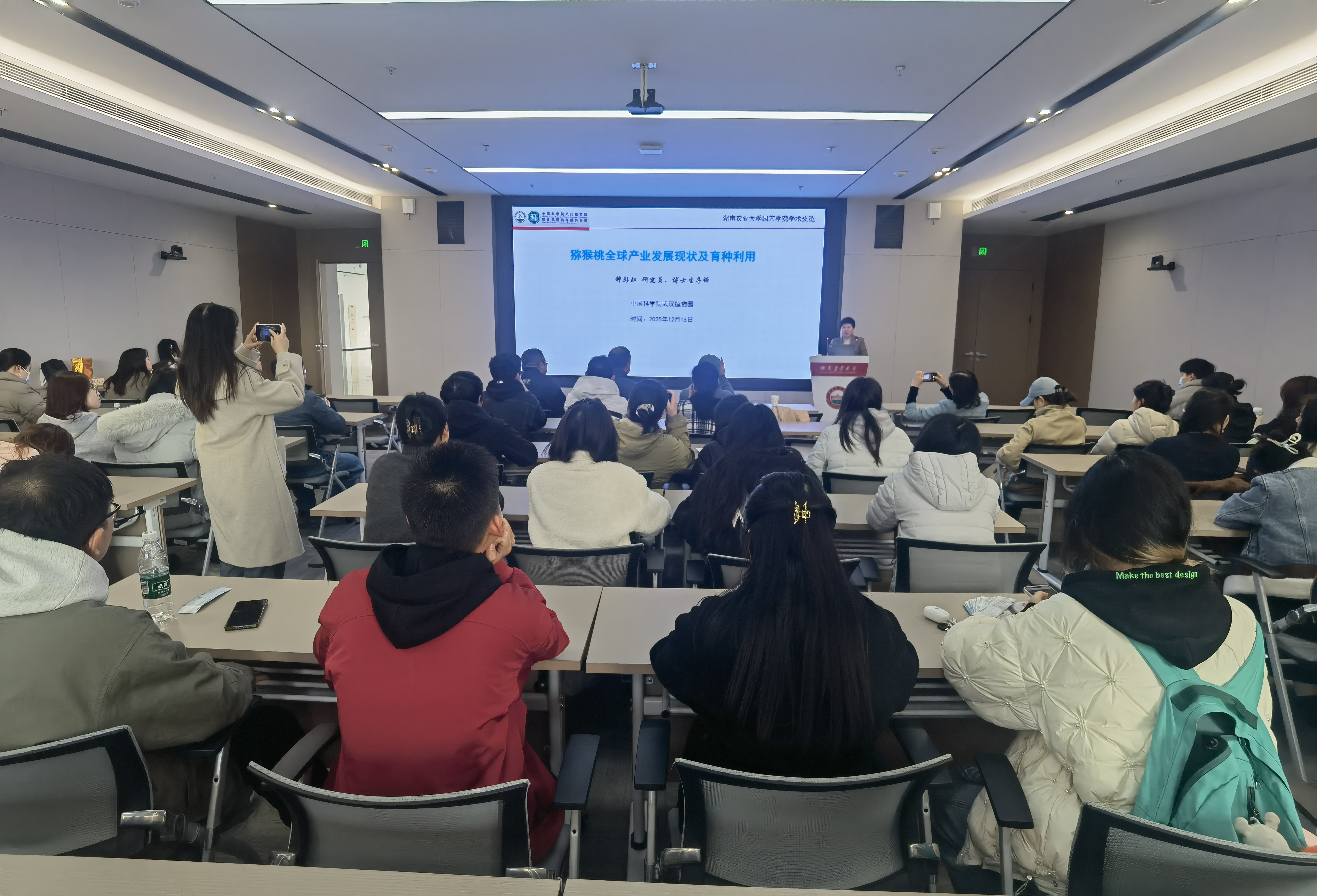 互动环节气氛热烈,参会师生围绕“年轻人如何长期坚守深耕一件事”、“即食猕猴桃产业发展”、“猕猴桃品种权保护”等方面问题踊跃提问。钟彩虹研究员对每个问题都逐一耐心解答,给出了专业详实、通俗易懂的回应。与此同时,她向在场学弟学妹分享了自己30余载深耕猕猴桃领域的初心与坚守,这份坚守源于对园艺事业的赤诚热爱。她勉励年轻学子把握时代发展的大好机遇,脚踏实地、稳扎稳打,先立足岗位夯实基础,再逐步探索突破、谋求长远发展。