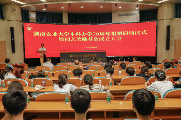 本网讯(校友办 周燕)9月24日下午,学校本科办学70周年捐赠启动仪式暨园艺奖励基金成立大会在生命科学楼国际会议厅举行。学校党委书记陈弘,中国工程院院士、校长邹学校,校党委副书记段美娟;湖南湘研种业有限公司董事长何久春,总经理刘荣云;湖南兴蔬种业有限公司执行董事张大伟,总经理邹家华;江苏镇研种业有限公司董事长卢国强;宁夏泰金种业有限公司董事长裴卓强;湖南省湘江源农业科技发展有限公司总经理邓召利;西藏绿之源现代农业科技股份有限公司总经理王真君出席仪式。学校教育基金会、永利yl23411负责人及校友、师生代表参加。段美娟主持仪式。