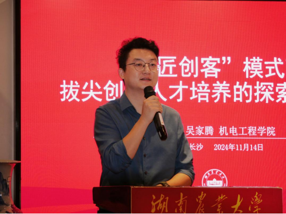 随后,机电工程学院教师吴家腾作了题为“‘闯匠创客’模式下拔尖创新人才培养的探索与实践”的报告。吴家腾老师首先对拔尖创新人才的概念进行了阐释,并分析了本科阶段在培养学生创新思维和实践能力方面所面临的挑战。他详细介绍了“闯匠创客”的三集三训模式,即“学生集中训练、老师集中指导、团队集合资源”以及“理论知识训练、实践能力训练、‘实训实战’‘以赛代训’”。这一模式旨在通过系统的训练和实践,全面提升学生的创新创业能力。